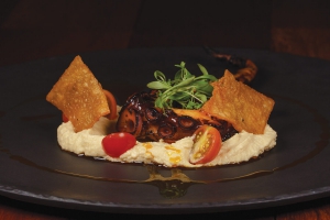 « Ceviche vert, poulpe et chicharrón. Je pense que le ceviche est quelque chose que nous avons dans notre ADN. L'essayer différemment attire l'attention. Le poulpe est un mollusque qui l'aime vraiment beaucoup. À 5inco, nous le préparons avec beaucoup d'amour et nous lui donnons une fusion de saveurs avec du hummus et remplaçons l'olive par une infusion d'huile de saucisse de table. Et bien, le chicharrón, c'est du chicharrón : nous sommes tous dodus de l'âme. »